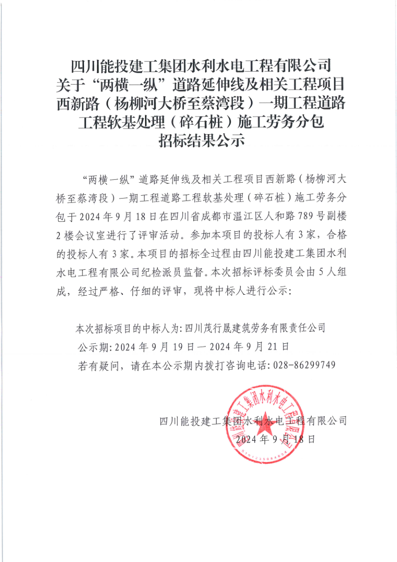 “两横一纵”道路延伸线及相关工程项目西新路(杨柳河大桥至蔡湾段)一期工程道路工程软基处理(碎石桩)施工劳务分包招标结果公示