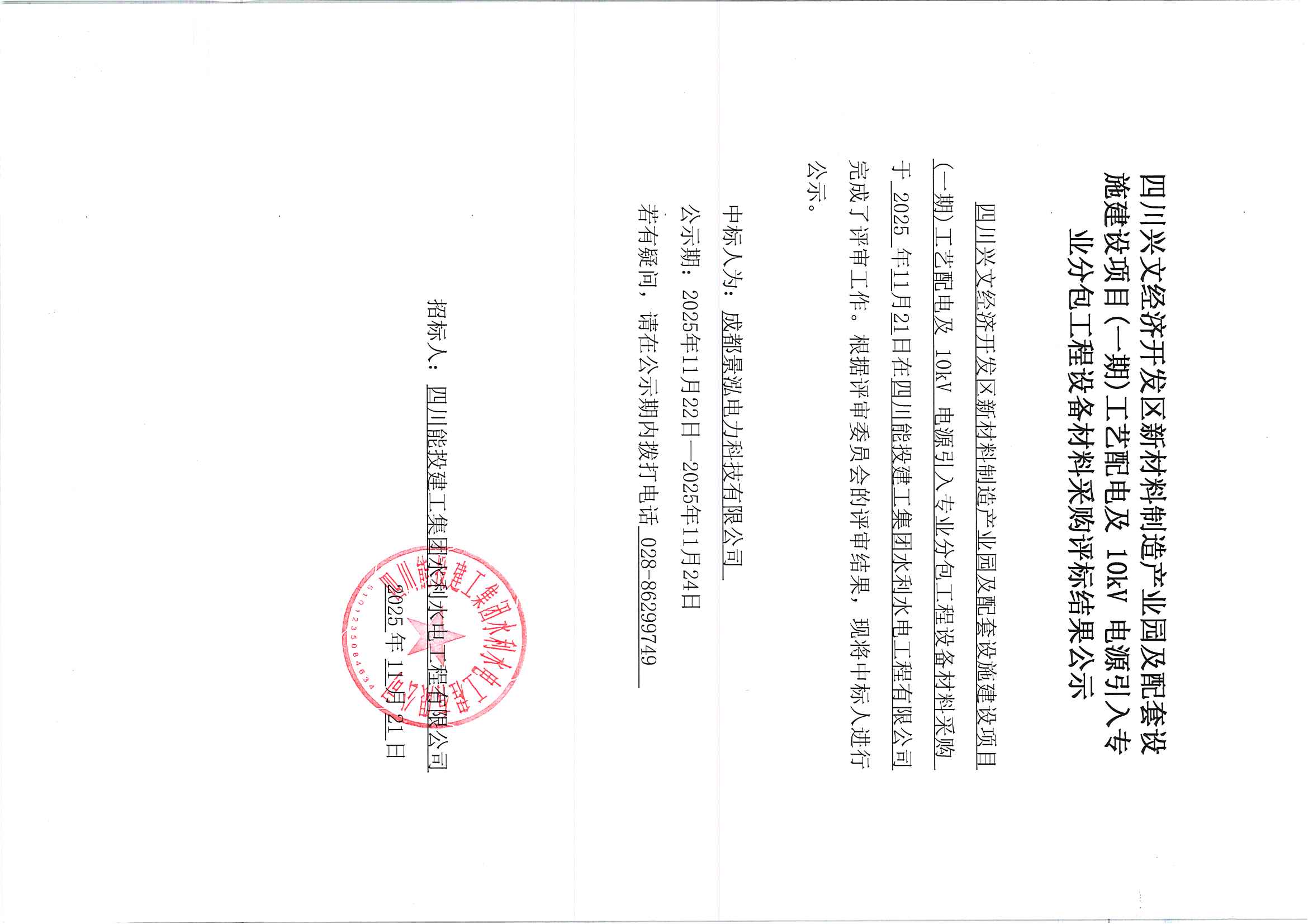 四川兴文经济开发区新材料制造产业园及配套设施建设项目(一期)工艺配电及10kV电源引入专业分包工程设备材料采购评标结果公示