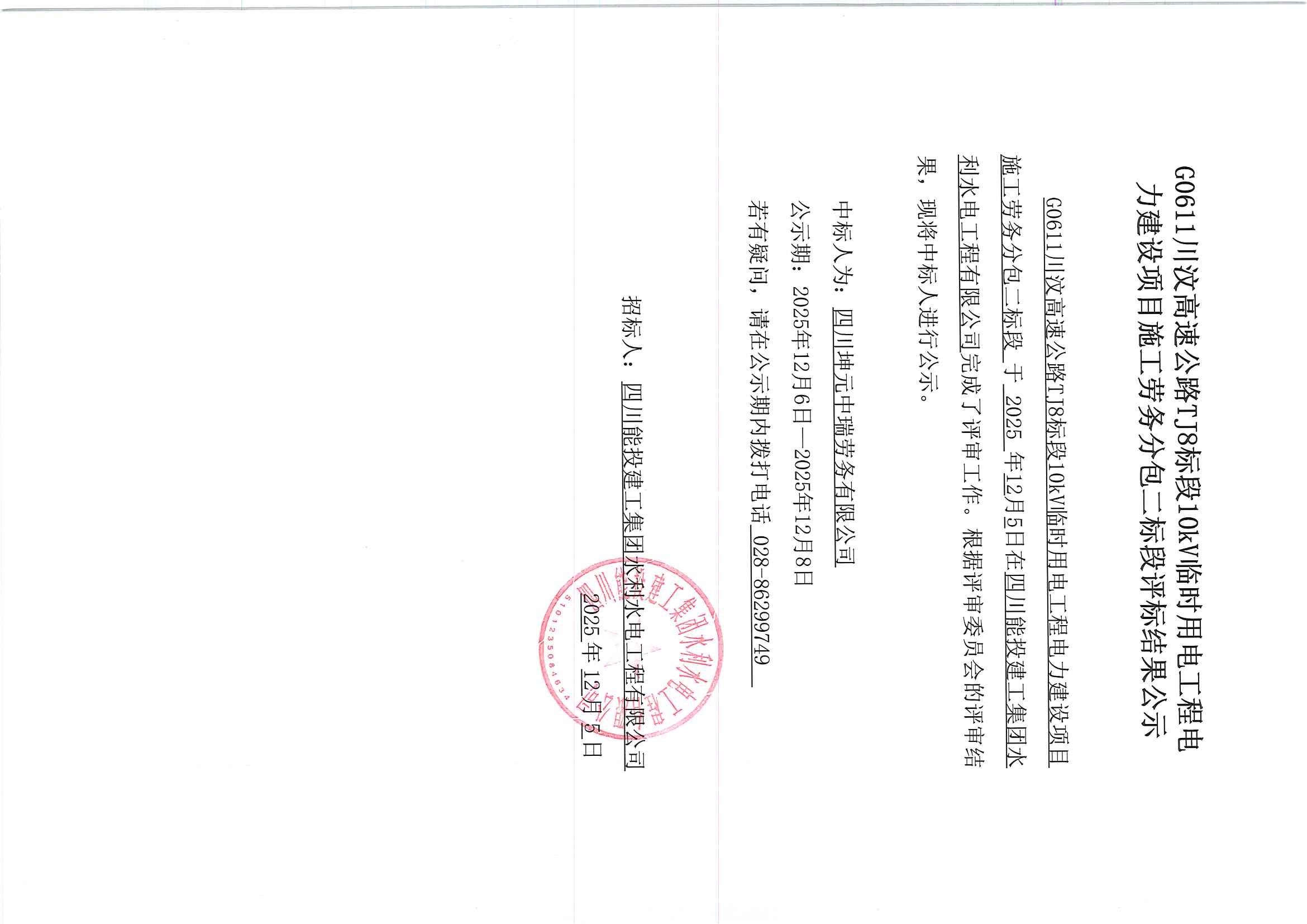 G0611川汶高速公路TJ8标段10kV临时用电工程电力建设项目施工劳务分包一标段评标结果公示
