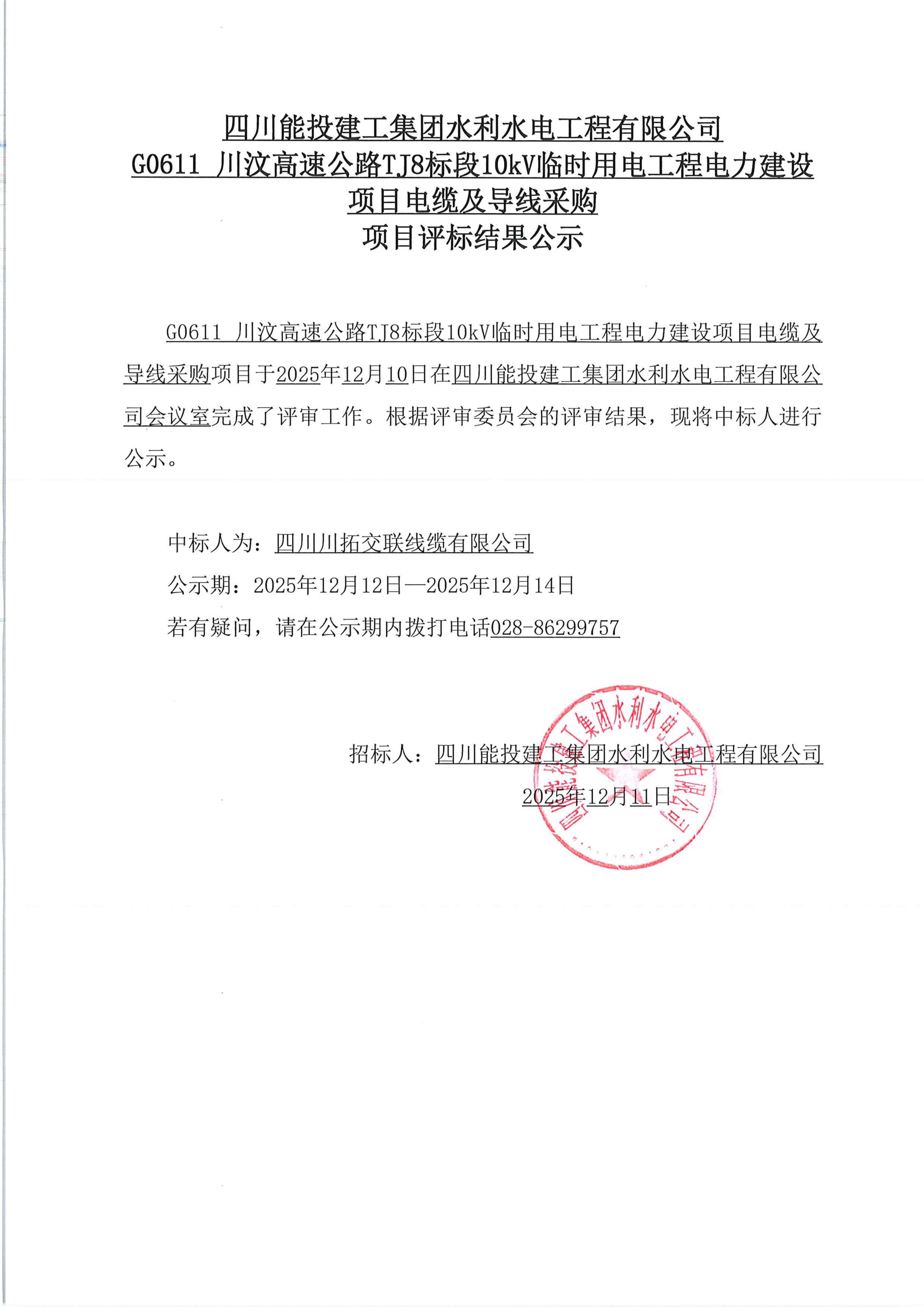 G0611 川汶高速公路TJ8标段10kV临时用电工程电力建设项目电缆及导线采购项目评标结果公示